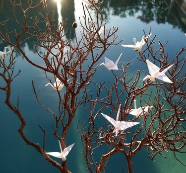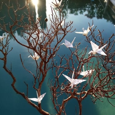 L’apprentissage de la calligraphie chinoise l’amène également à travailler l’origami, l’art du pliage au travers de ses compositions de grues posées sur une branche de romarin, de ciste glanée dans le massif des Alpilles où elle a installé son atelier.